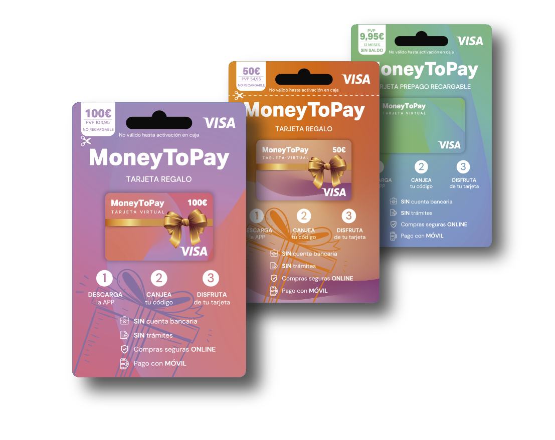 Tarjetas regalo MoneyToPay de 50€ y 100€, aptas para comprar en cualquier comercio que acepte VISA.